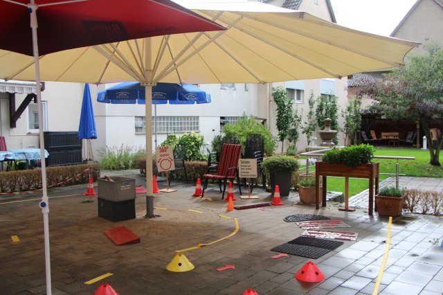 Spezielle Übungen mit Hindernis-Bewältigung durch den Rollator Parcours im Garten; individuelle Tipps und Hinweise.